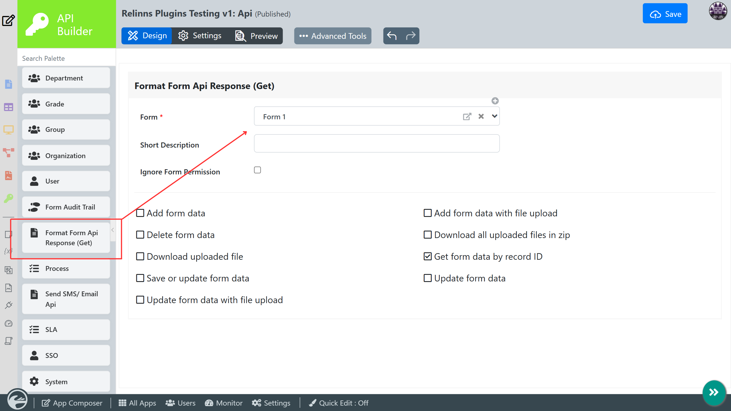 - From the API Builder or app plugin settings, select Format Form API Response (GET) plugin.