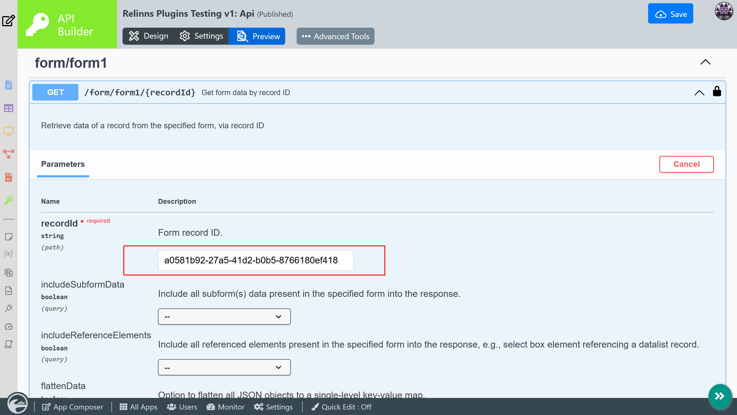 - You can also use optional query parameters like includeSubformData, flattenData, and includeReferenceElements just like the default plugin.