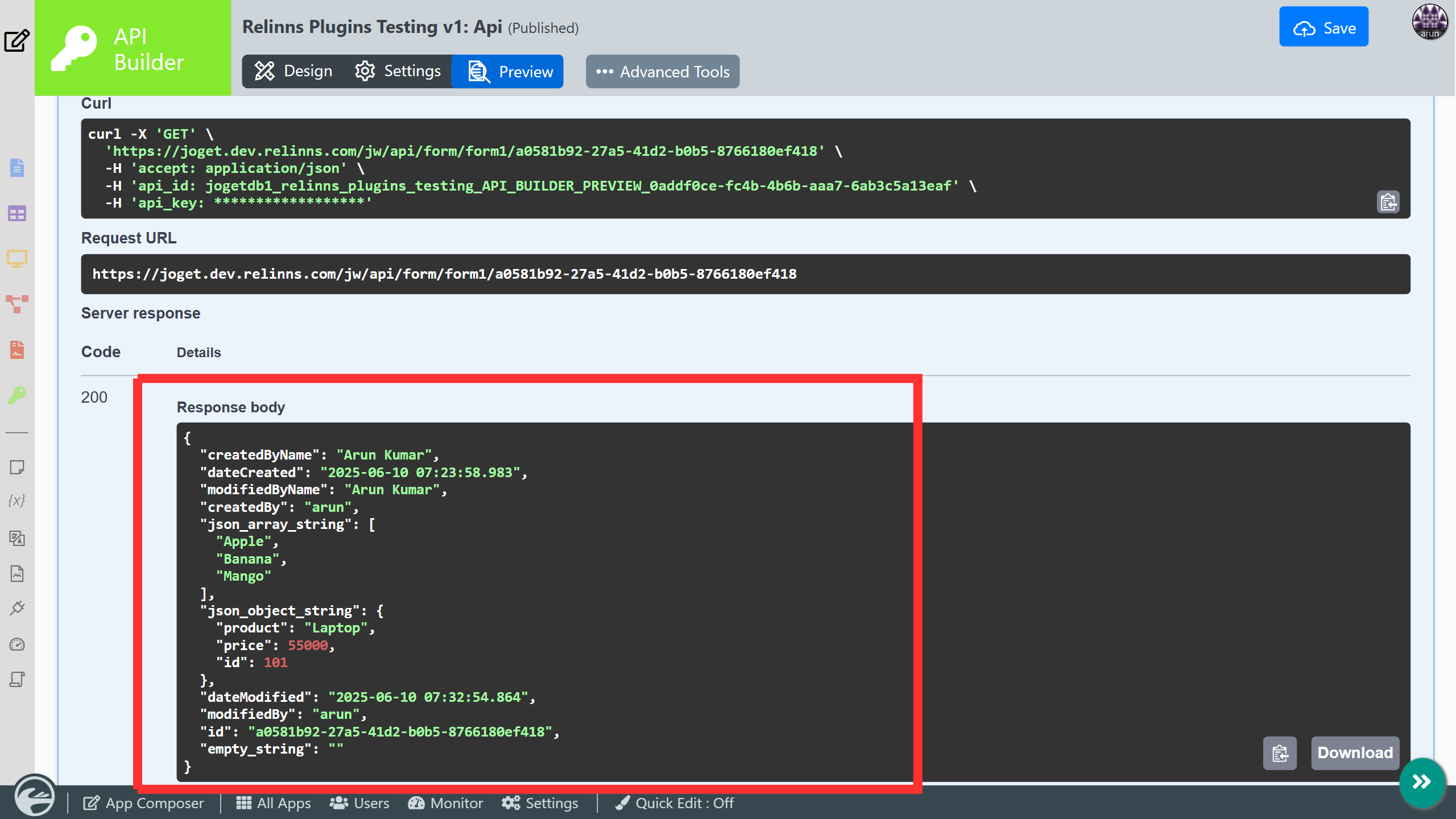 - Format Form API Response (GET) is a modified version of the official Joget Form API plugin, developed by Relinns Technologies, to address a limitation in the default GET API endpoint.