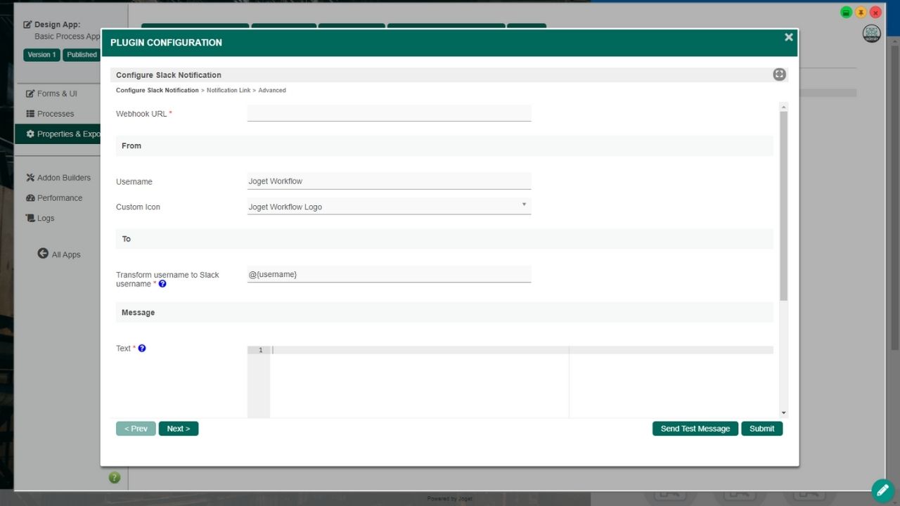 The Slack Notification Plugin is a Joget plugin that automatically sends a message to the corresponding Slack Messaging user on new process tasks.