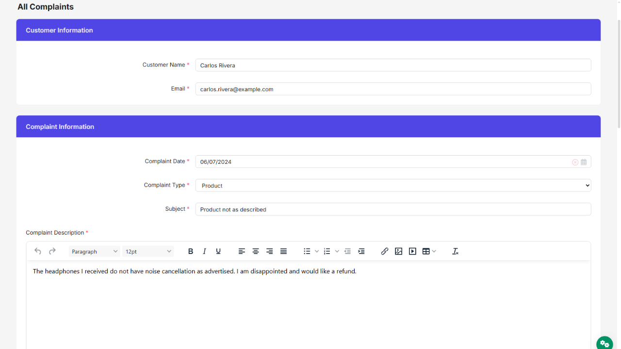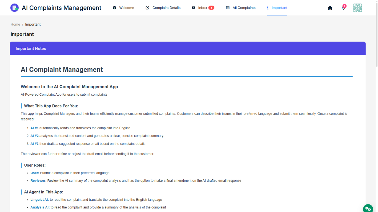 The AI Complaints Management App helps Complaint Managers and their teams efficiently manage customer-submitted complaints.