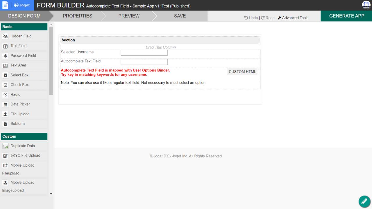 - Open your Joget Form Builder and drag this new plugin into your form and edit the properties accordingly.