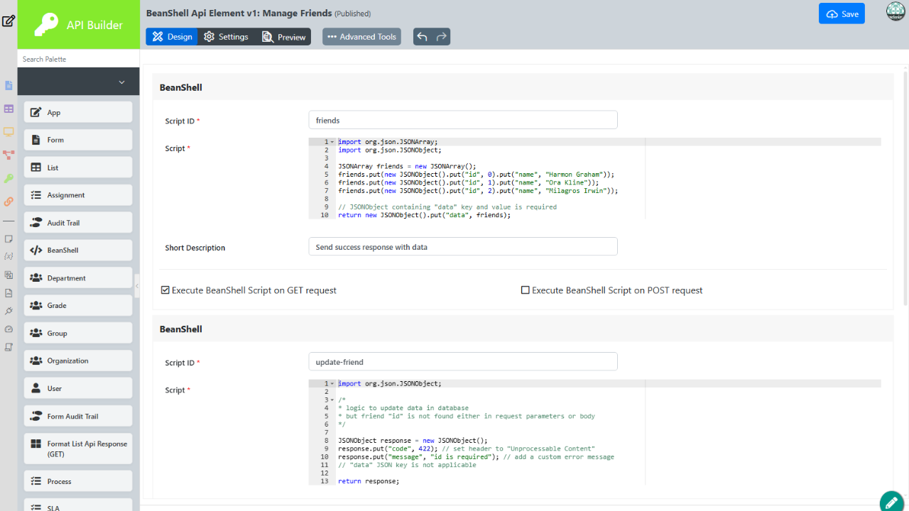 - The Bean Shell API Element allows you to create arbitrary endpoints in API Builder that execute Bean Shell scripts.