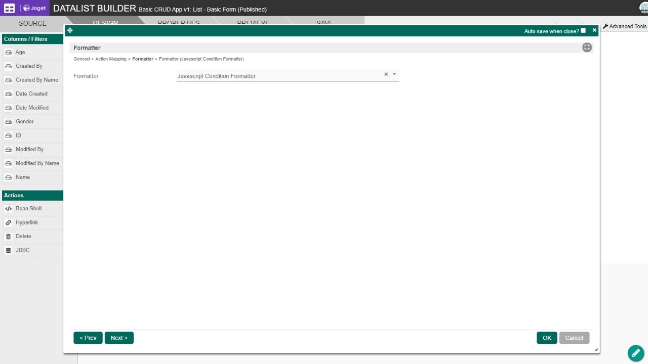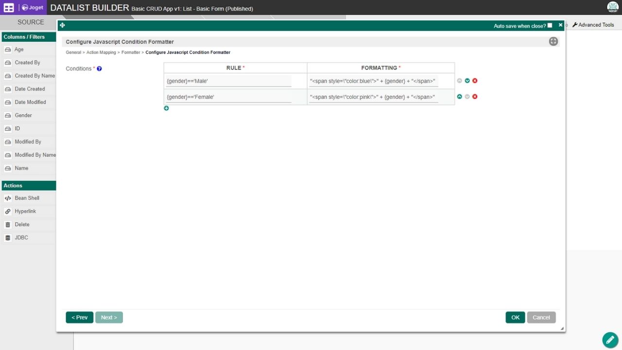 - In "Configure Javascript Condition Formatter" tab, you can enter as follows: