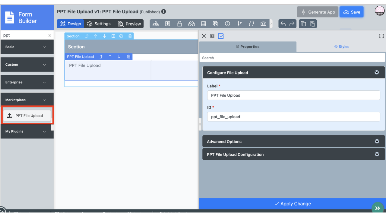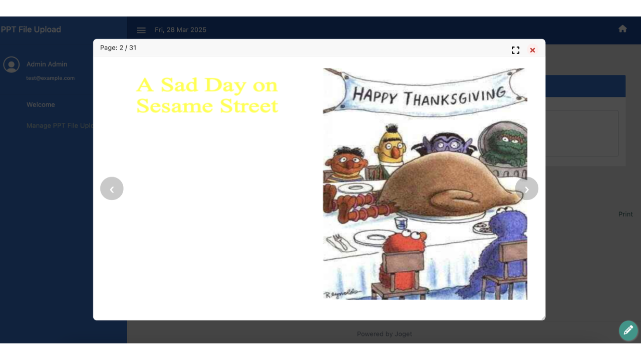 The PPT File Upload plugin enables PowerPoint file uploads and provides an embedded slideshow viewer for viewing presentations with a click of an icon.